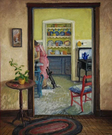 For a few weeks, it sat leaning against the wall with a set of unused picture frames. We weren't quite sure what to make of it, or even if we liked it. It seemed so plainspoken, in a homespun American style that had no congruity whatsoever with our artistic sensibilities. The way the painter chose to leave the scene in medias res, the woman's face completely out of view yet her body showing focused intent, the half-askew placemat in the foreground, the cupboard with dishes arrayed in a perfectly measured form: each element is mindfully arranged and yet completely bare of explicit meaning.